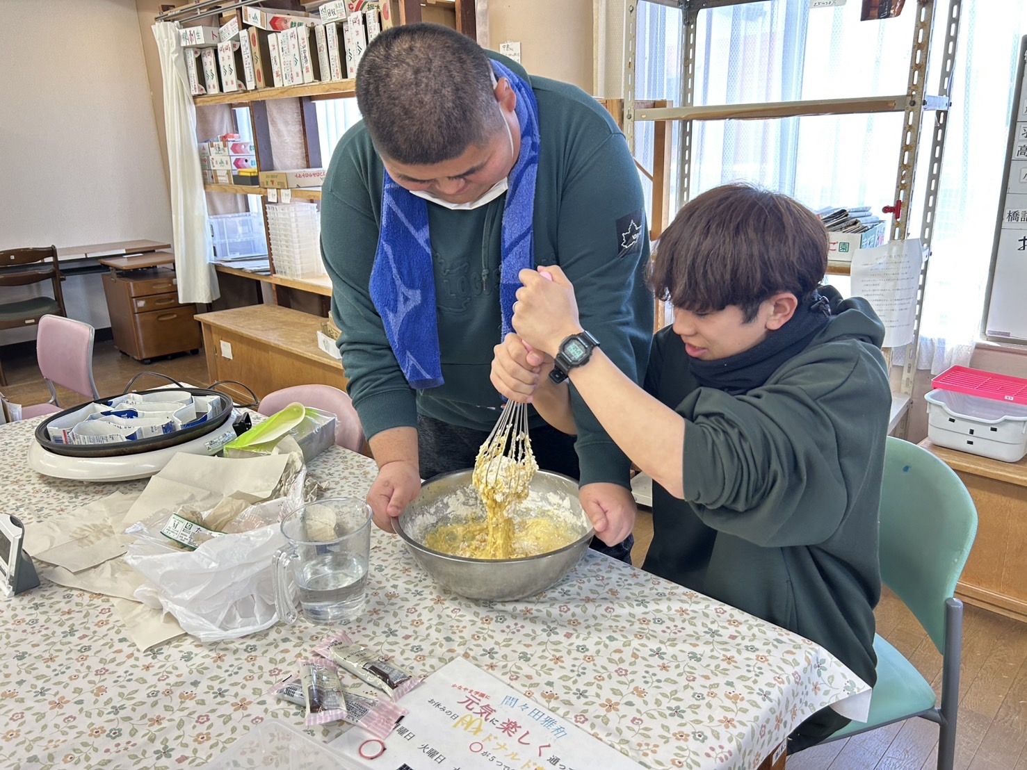 5/6(振替休日)の活動 5/5のこどもの日にちなみ、それぞれに合った活動をしました。B班は折り紙でかぶとと鯉のぼりを作りました。出来上がった作品を見て達成感にあふれた表情されていました。E班はみんなで柏餅をいただきカラオケを楽しみました。歌うのが好きな人聴くのが好きな人それぞれの楽しみ方で盛り上がりました。 B班 かぶとと鯉のぼり完成! E班 楽しそうに歌っています D班 あまりのおいしさにビックリ!